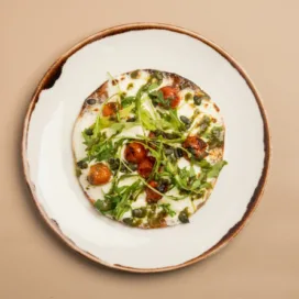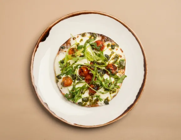 - Hummus de garbanzos con tahini y lima con tomate ibérico, cilantro y crakers de semillas y espirulina.
