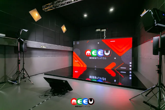 El escenario LED más amplio de MEEU Platós – Si buscas lo mejor de lo mejor, esta sala es para ti. Con una pantalla LED de dimensiones impresionantes y un escenario de 35 m2, tus eventos serán inolvidables.